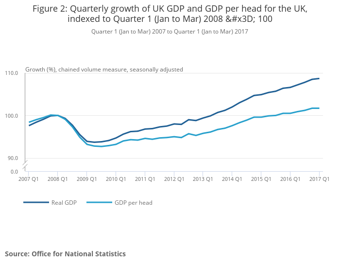 - GDP per head in volume terms was flat between Quarter 4 2016 and Quarter 1 2017.