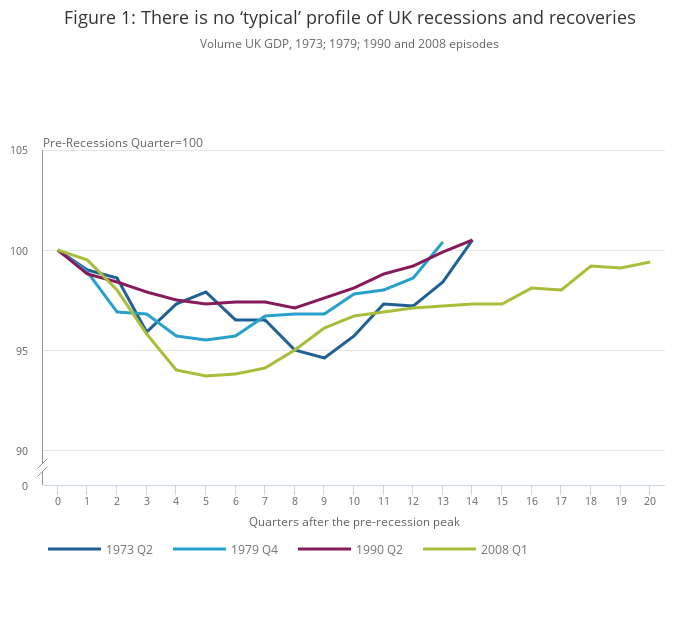 - Pre-recession quarters have been identified as Quarter 2 1973, Quarter 4 1979, Quarter 2 1990, and Quarter 1 2008. This includes the preceding quarter, which captures the impact of real-time identification of these ‘technical’ recessions. It covers up to when the latest estimates show UK GDP recovered to pre-recession levels.