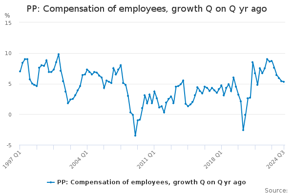 Download this time seriesPP: Compensation of employees, growth Q on Q yr ago