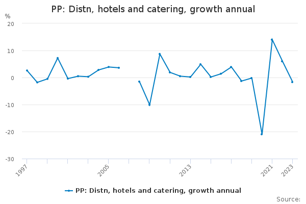 Download this time seriesPP: Distn, hotels and catering, growth annual