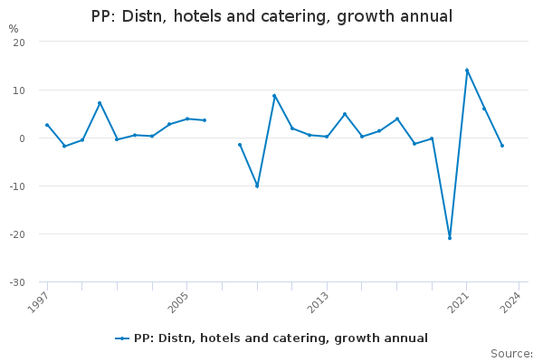 Download this time seriesPP: Distn, hotels and catering, growth annual