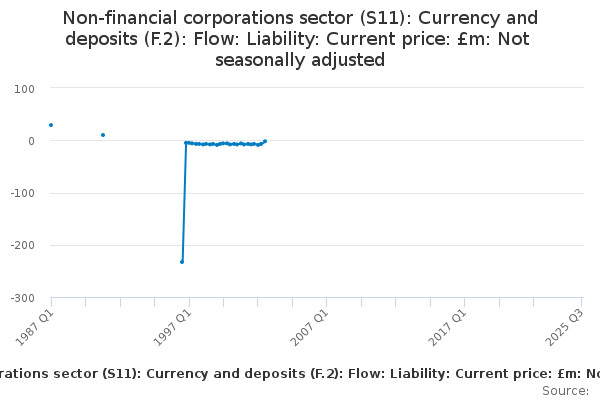 Download this time seriesNon-financial corporations sector (S11): Currency and deposits (F.2): Flow: Liability: Current price: £m: Not seasonally adjusted