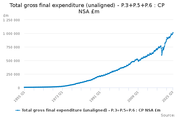 Download this time seriesTotal gross final expenditure (unaligned) - P.3+P.5+P.6 : CP NSA £m
