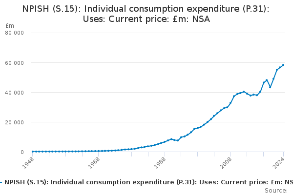 Download this time seriesNPISH (S.15): Individual consumption expenditure (P.31): Uses: Current price: £m: NSA