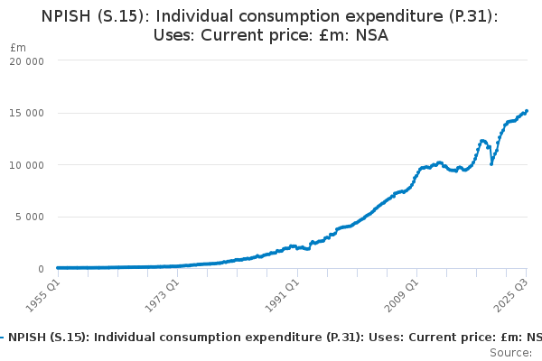 Download this time seriesNPISH (S.15): Individual consumption expenditure (P.31): Uses: Current price: £m: NSA