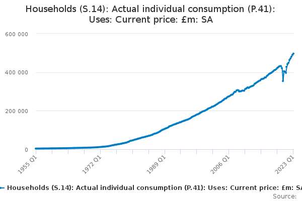 Download this time seriesHouseholds (S.14): Actual individual consumption (P.41): Uses: Current price: £m: SA