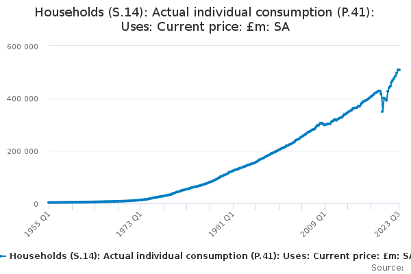 Download this time seriesHouseholds (S.14): Actual individual consumption (P.41): Uses: Current price: £m: SA