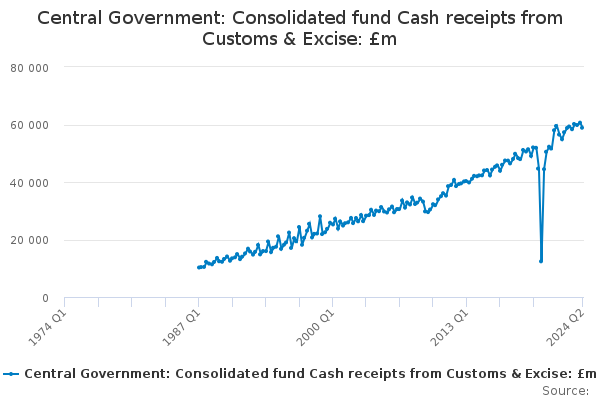 Download this time seriesCentral Government: Consolidated fund Cash receipts from Customs & Excise: £m