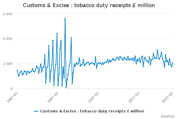 Download this time seriesCustoms & Excise : tobacco duty receipts £ million