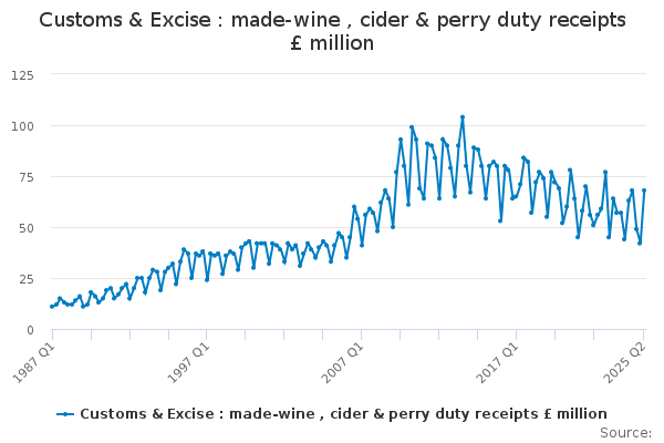 Download this time seriesCustoms & Excise : made-wine , cider & perry duty receipts £ million