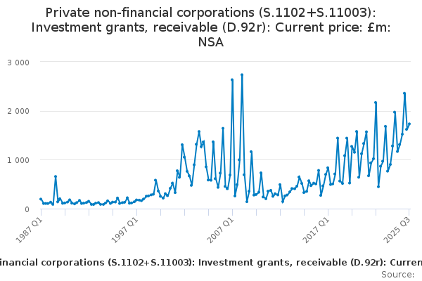 Download this time seriesPrivate non-financial corporations (S.1102+S.11003): Investment grants, receivable (D.92r): Current price: £m: NSA
