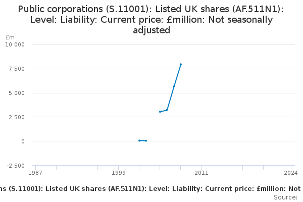 Download this time seriesPublic corporations (S.11001): Listed UK shares (AF.511N1): Level: Liability: Current price: £million: Not seasonally adjusted