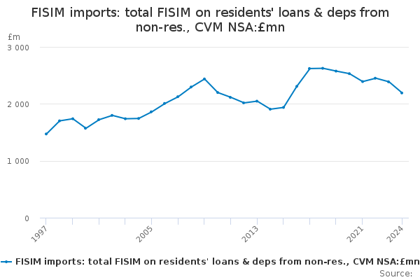 Download this time seriesFISIM imports: total FISIM on residents' loans & deps from non-res., CVM NSA:£mn