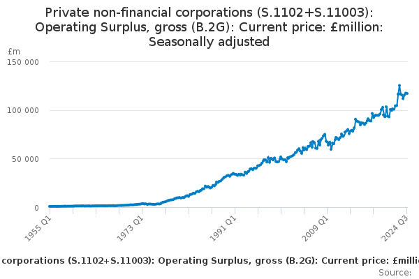 Download this time seriesPrivate non-financial corporations (S.1102+S.11003): Operating Surplus, gross (B.2G): Current price: £million: Seasonally adjusted