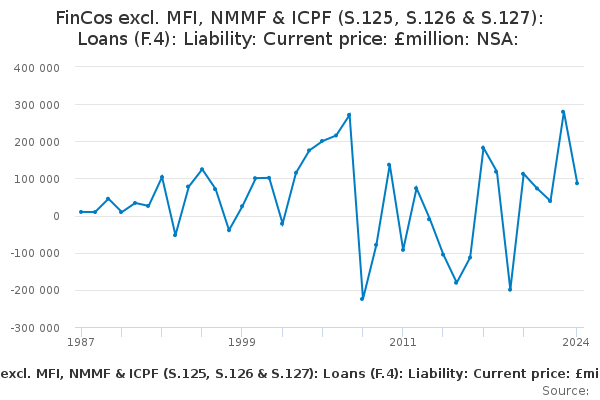 Download this time seriesFinCos excl. MFI, NMMF & ICPF (S.125, S.126 & S.127): Loans (F.4): Liability: Current price: £million: NSA: