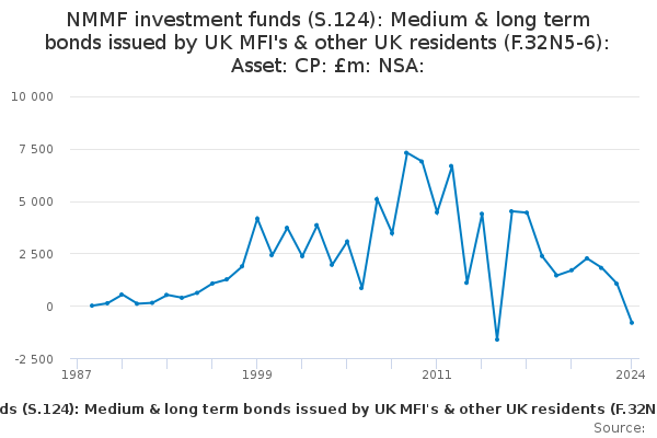 Download this time seriesNMMF investment funds (S.124): Medium & long term bonds issued by UK MFI's & other UK residents (F.32N5-6): Asset: CP: £m: NSA: