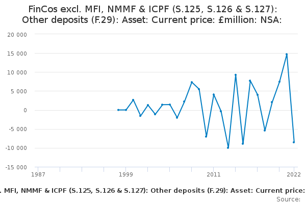 Download this time seriesFinCos excl. MFI, NMMF & ICPF (S.125, S.126 & S.127): Other deposits (F.29): Asset: Current price: £million: NSA: