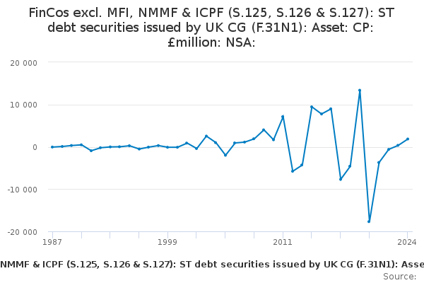 Download this time seriesFinCos excl. MFI, NMMF & ICPF (S.125, S.126 & S.127): ST debt securities issued by UK CG (F.31N1): Asset: CP: £million: NSA: