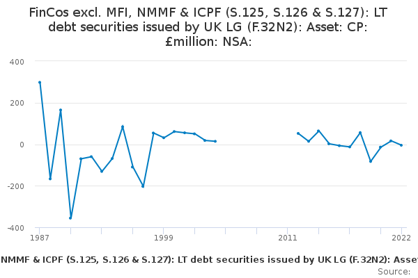 Download this time seriesFinCos excl. MFI, NMMF & ICPF (S.125, S.126 & S.127): LT debt securities issued by UK LG (F.32N2): Asset: CP: £million: NSA: