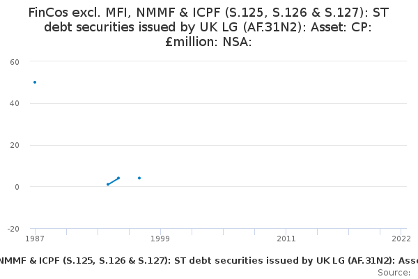 Download this time seriesFinCos excl. MFI, NMMF & ICPF (S.125, S.126 & S.127): ST debt securities issued by UK LG (AF.31N2): Asset: CP: £million: NSA: