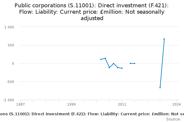 Download this time seriesPublic corporations (S.11001): Direct investment (F.421): Flow: Liability: Current price: £million: Not seasonally adjusted