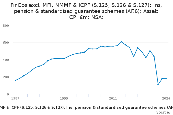Download this time seriesFinCos excl. MFI, NMMF & ICPF (S.125, S.126 & S.127): Ins, pension & standardised guarantee schemes (AF.6): Asset: CP: £m: NSA: