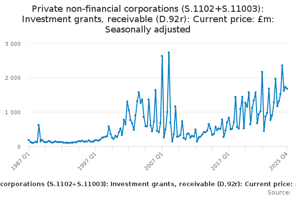Download this time seriesPrivate non-financial corporations (S.1102+S.11003): Investment grants, receivable (D.92r): Current price: £m: Seasonally adjusted