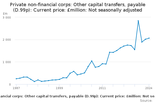 Download this time seriesPrivate non-financial corps: Other capital transfers, payable (D.99p): Current price: £million: Not seasonally adjusted