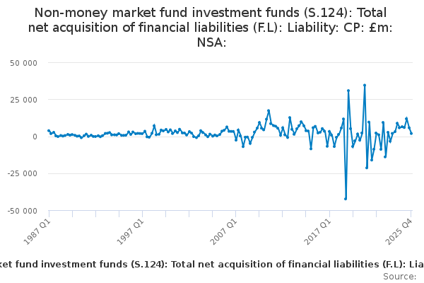 Download this time seriesNon-money market fund investment funds (S.124): Total net acquisition of financial liabilities (F.L): Liability: CP: £m: NSA: