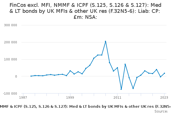 Download this time seriesFinCos excl. MFI, NMMF & ICPF (S.125, S.126 & S.127): Med & LT bonds by UK MFIs & other UK res (F.32N5-6): Liab: CP: £m: NSA: