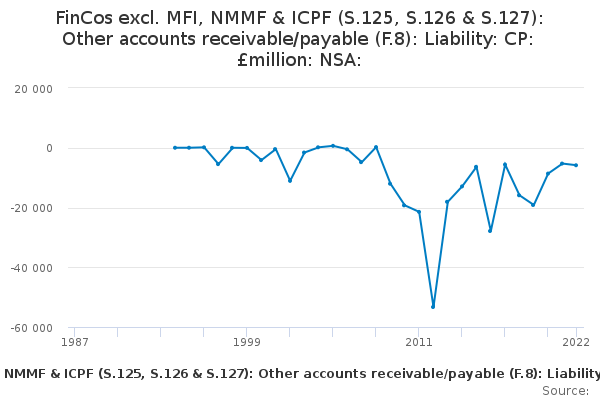 Download this time seriesFinCos excl. MFI, NMMF & ICPF (S.125, S.126 & S.127): Other accounts receivable/payable (F.8): Liability: CP: £million: NSA: