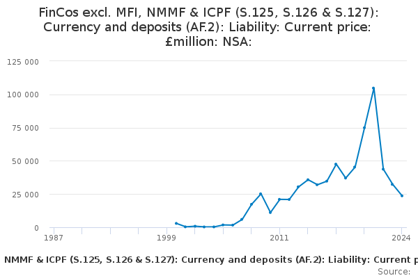 Download this time seriesFinCos excl. MFI, NMMF & ICPF (S.125, S.126 & S.127): Currency and deposits (AF.2): Liability: Current price: £million: NSA: