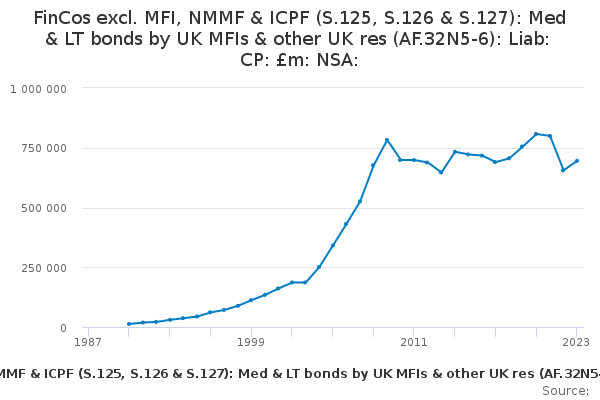 Download this time seriesFinCos excl. MFI, NMMF & ICPF (S.125, S.126 & S.127): Med & LT bonds by UK MFIs & other UK res (AF.32N5-6): Liab: CP: £m: NSA: