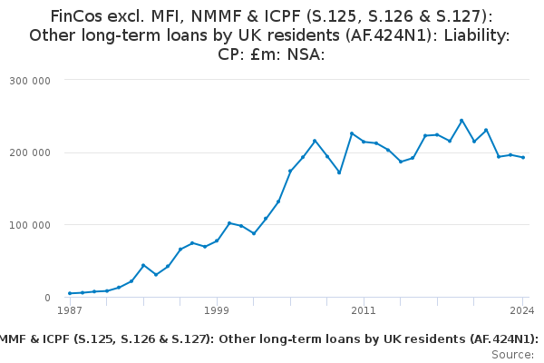 Download this time seriesFinCos excl. MFI, NMMF & ICPF (S.125, S.126 & S.127): Other long-term loans by UK residents (AF.424N1): Liability: CP: £m: NSA: