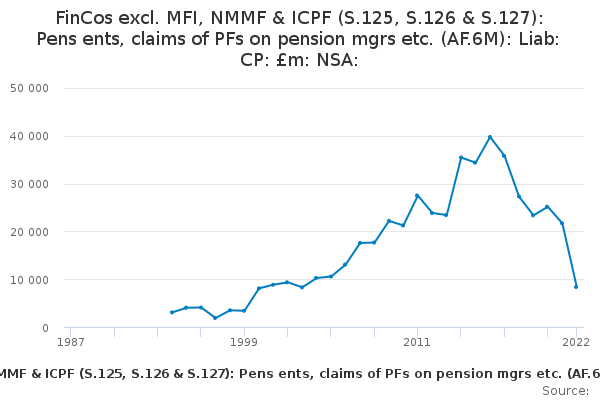 Download this time seriesFinCos excl. MFI, NMMF & ICPF (S.125, S.126 & S.127): Pens ents, claims of PFs on pension mgrs etc. (AF.6M): Liab: CP: £m: NSA: