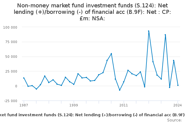 Download this time seriesNon-money market fund investment funds (S.124): Net lending (+)/borrowing (-) of financial acc (B.9F): Net : CP: £m: NSA: