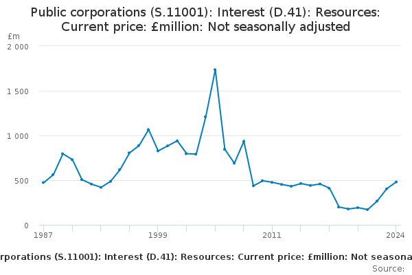 Download this time seriesPublic corporations (S.11001): Interest (D.41): Resources: Current price: £million: Not seasonally adjusted