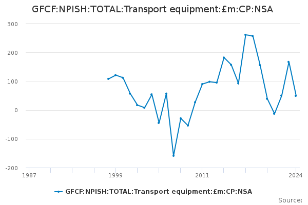 Download this time seriesGFCF:NPISH:TOTAL:Transport equipment:£m:CP:NSA