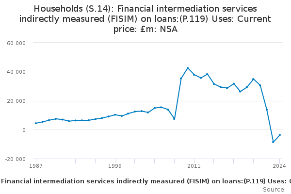 Download this time seriesHouseholds (S.14): Financial intermediation services indirectly measured (FISIM) on loans:(P.119) Uses: Current price: £m: NSA