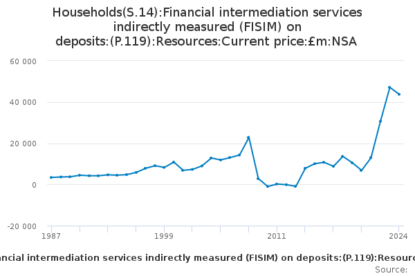 Download this time seriesHouseholds(S.14):Financial intermediation services indirectly measured (FISIM) on deposits:(P.119):Resources:Current price:£m:NSA