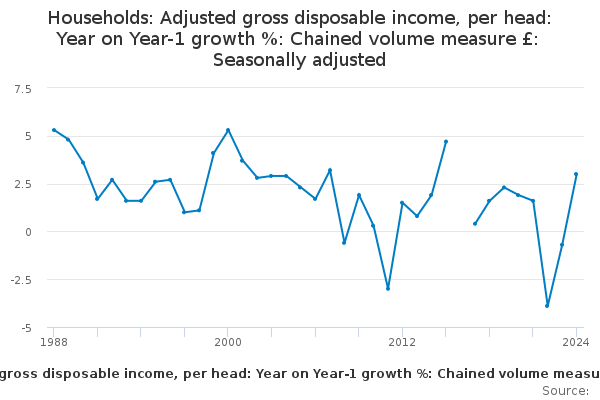 Download this time seriesHouseholds: Adjusted gross disposable income, per head: Year on Year-1 growth %: Chained volume measure £: Seasonally adjusted