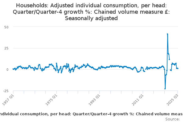 Download this time seriesHouseholds: Adjusted individual consumption, per head: Quarter/Quarter-4 growth %: Chained volume measure £: Seasonally adjusted