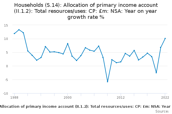 Download this time seriesHouseholds (S.14): Allocation of primary income account (II.1.2): Total resources/uses: CP: £m: NSA: Year on year growth rate %