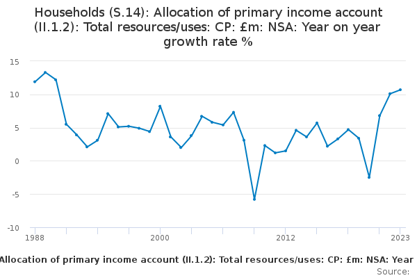Download this time seriesHouseholds (S.14): Allocation of primary income account (II.1.2): Total resources/uses: CP: £m: NSA: Year on year growth rate %