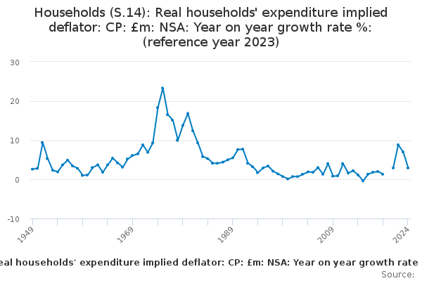 Download this time seriesHouseholds (S.14): Real households' expenditure implied deflator: CP: £m: NSA: Year on year growth rate %: (reference year 2023)