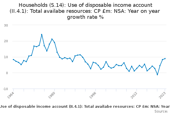 Download this time seriesHouseholds (S.14): Use of disposable income account (II.4.1): Total availabe resources: CP £m: NSA: Year on year growth rate %