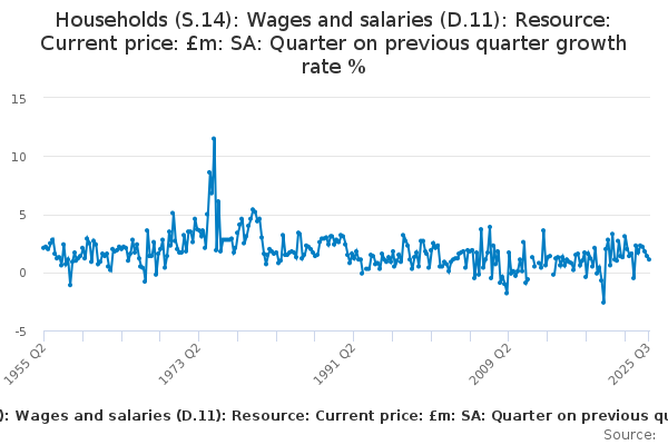 Download this time seriesHouseholds (S.14): Wages and salaries (D.11): Resource: Current price: £m: SA: Quarter on previous quarter growth rate %