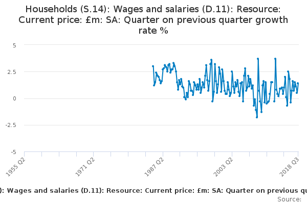 Download this time seriesHouseholds (S.14): Wages and salaries (D.11): Resource: Current price: £m: SA: Quarter on previous quarter growth rate %