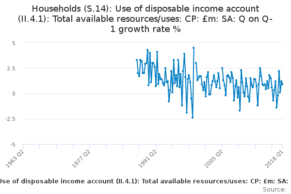 Download this time seriesHouseholds (S.14): Use of disposable income account (II.4.1): Total available resources/uses: CP: £m: SA: Q on Q-1 growth rate %
