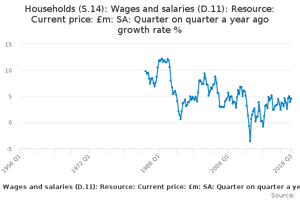 Download this time seriesHouseholds (S.14): Wages and salaries (D.11): Resource: Current price: £m: SA: Quarter on quarter a year ago growth rate %